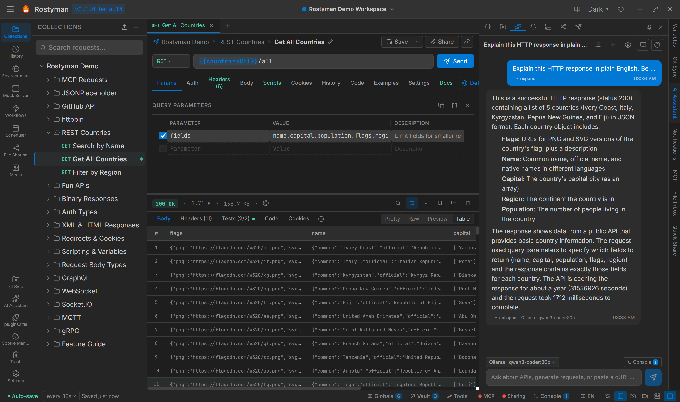 After receiving a response, ask the AI to write post-response test scripts using the rm.test() API — asserting status, checking specific fields, validating schema structure.