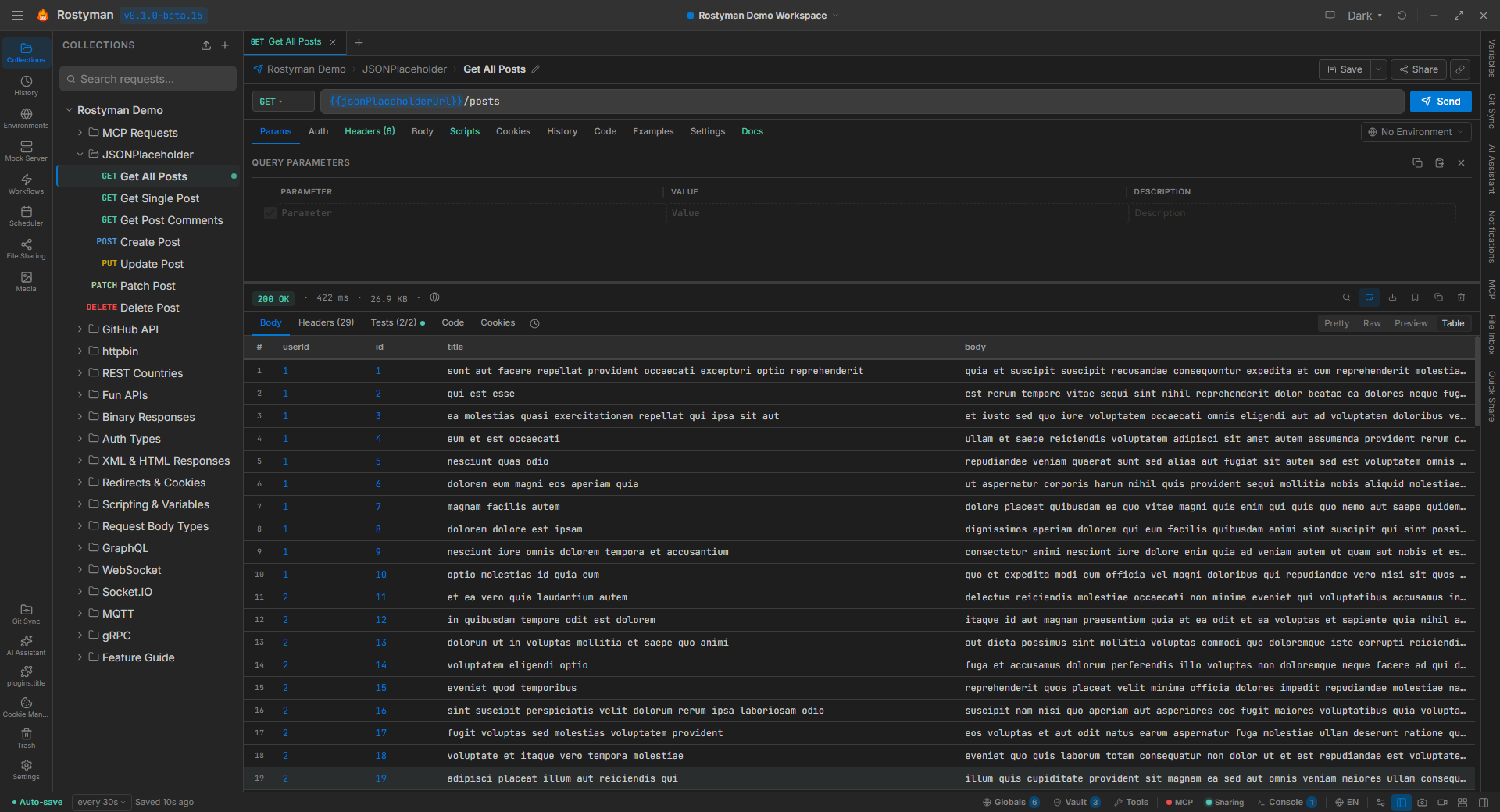 From simple REST calls to streaming WebSockets and AI agent tools via MCP — Rostyman handles every protocol your stack uses without switching apps or installing plugins.