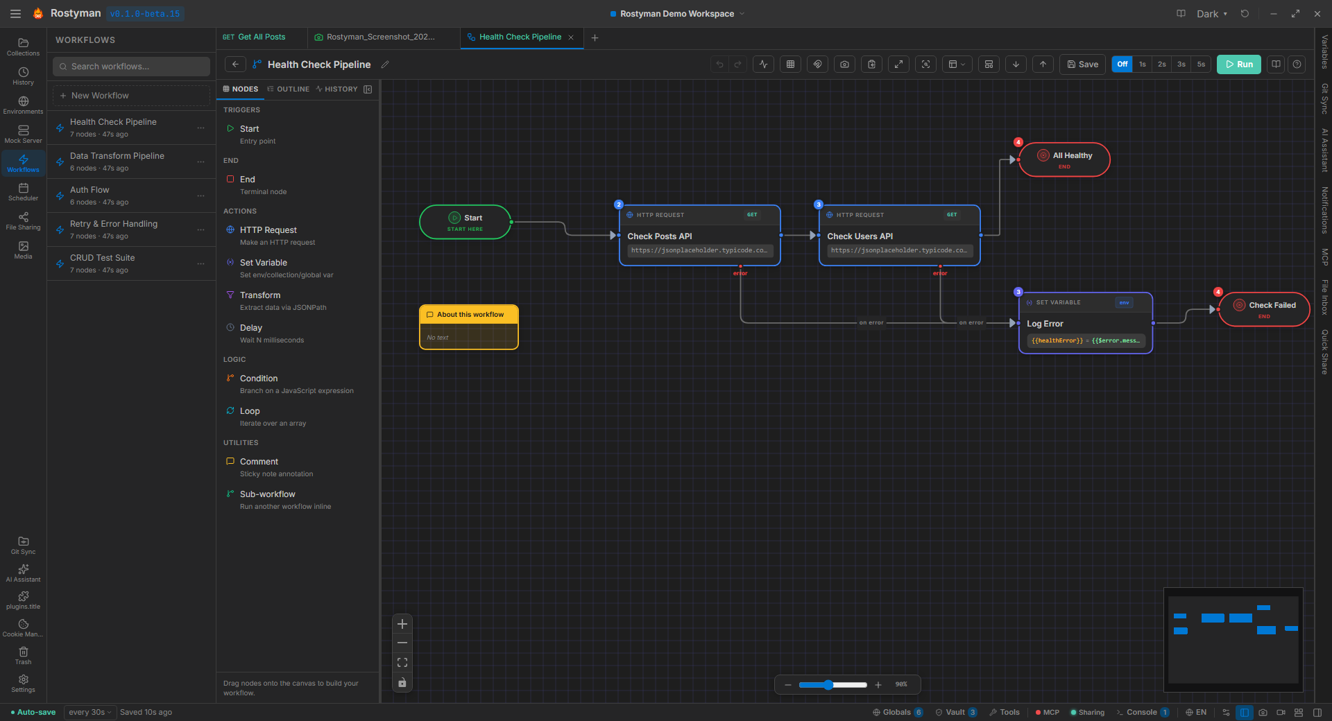 Build sophisticated API workflows with a drag-and-drop visual editor. Chain requests, add conditions, loops, transforms, and retry logic — without writing orchestration code.